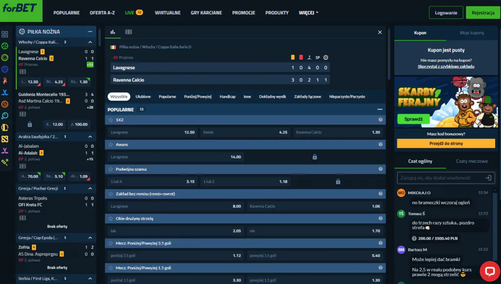 forBET to mistrz w zakładach live. Oferta na piłkę nożną i ręczną, tenis i żużel jest naprawdę rozbudowana, a statystyki na żywo dają Ci szczegółowy wgląd w grę. Bonus? Zakład bez ryzyka do 1200 zł, a w pakiecie nawet 3000 zł.